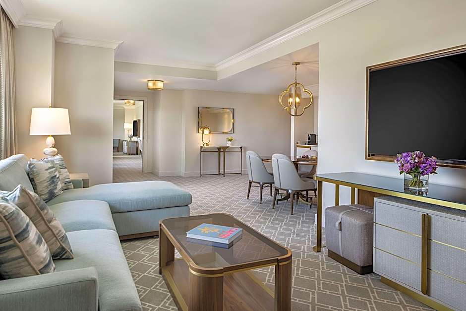 This room features a 55-inch flat-screen TV with streaming capabilities, Mini-bar, Nespresso machine, Luxury, bathroom products alarm clock with 2 USB outlets and Bluetooth speaker and wet bar with subzero refrigerator. Extras include a desk, in-room coffee machine, and an Italian marble bathroom with a bathtub. This room has living room with queen-size sleeper sofa and 65-inch LCD TV.